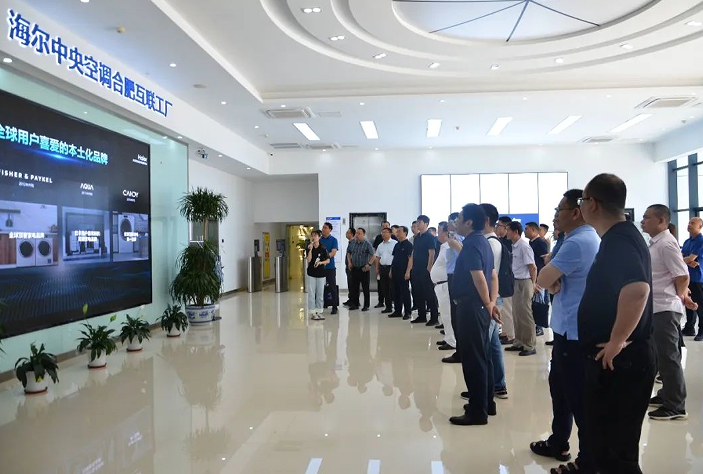 结束了合锻智能的考察交流后,考察团一行来到了海尔中央空调合肥互联工厂。2023年底,世界经济论坛发布第11批全球“灯塔工厂”名单中,海尔中央空调合肥互联工厂成功入选。“灯塔工厂”被誉为“世界上最先进的工厂”,代表当今全球制造业领域智能制造和数字化最高水平。在工厂展厅里,讲解员向大家播放了合肥海尔工厂的宣传片,简要介绍了中央空调工厂布局、产线设计、产品特点等。参观完展厅后,在工厂负责人的带领下,考察团有序走进生产厂区,整洁的厂区环境、错落有致的绿地景观、别出心裁的休息园地都再向大家展示着一座世界五百强工厂的规范管理。走进车间,工厂负责人向考察团细致的讲解生产线的工艺布局与技术特点。在参观通道两侧悬挂着各类展板,上面是海尔集团生产经营的创新理念、是海尔集团“人单合一”模式的各种诠释、是海尔人持续探索生态品牌战略建设的点滴努力。